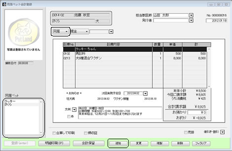 「同居ペット」から入力したいペットを選択し「追加」をクリックし診療内容を登録します。