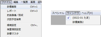 「ファイル」メニューから「診療業務」を選択すると新たに「ペット一覧」画面が表示されウィンドウメニューに「診療業務X」が追加されます。 |
