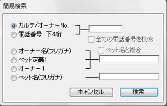 カルテNo、電話番号(下4 桁)、オーナー名(フリガナ)・ペット名(フリガナ)などで検索ができます。